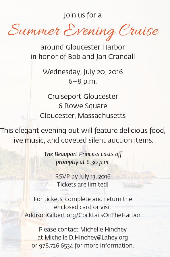 July 12, 2016 by Addison Gilbert Hospital Limited Tickets Still Availabe for Cocktails on the Harbor Host Committee John and Jan Bell Phil Chalmers and Susan King Clyde and Lucy Gillard Judy Gimik and Ron Kuerbitz Paul and Christine Lundberg Bob and Eileen Matz Barry and Susan Weiner Share this: Click to share on Facebook (Opens in new window) Facebook Click to share on LinkedIn (Opens in new window) LinkedIn Click to print (Opens in new window) Print Click to share on Tumblr (Opens in new window) Tumblr Click to share on X (Opens in new window) X Click to share on Pinterest (Opens in new window) Pinterest Click to email a link to a friend (Opens in new window) Email Click to share on Pocket (Opens in new window) Pocket Like Loading...