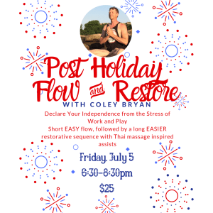 Join Coley for a short EASY flow, followed by a long EASIER restorative sequence with Thai massage inspired assists. Investment: $25 REGISTER HERE