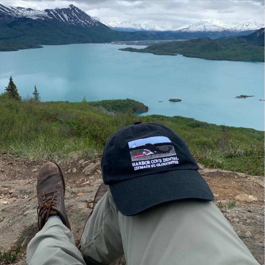 Dr. V is enjoying the views while hiking around Alaska. He made sure to take his Harbor Cove Dental hat with him.