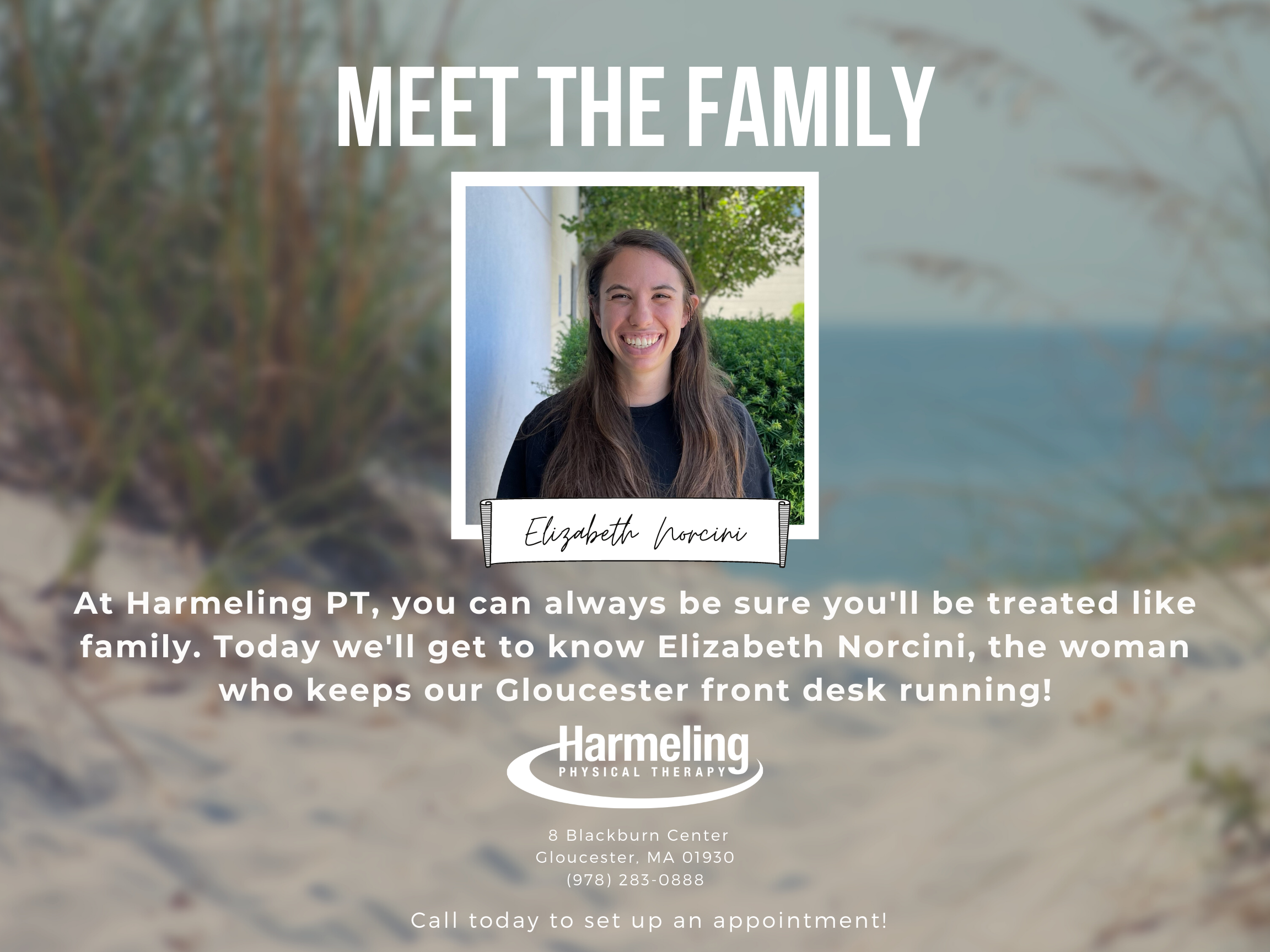 In this week’s edition of Harmeling PT’s Meet the Family series, we’re getting to know Elizabeth Norcini! Elizabeth has been with the practice since 2016, starting first as a rehab aide in our Wenham office, and working her way up to managing the front desk in our Gloucester location!
