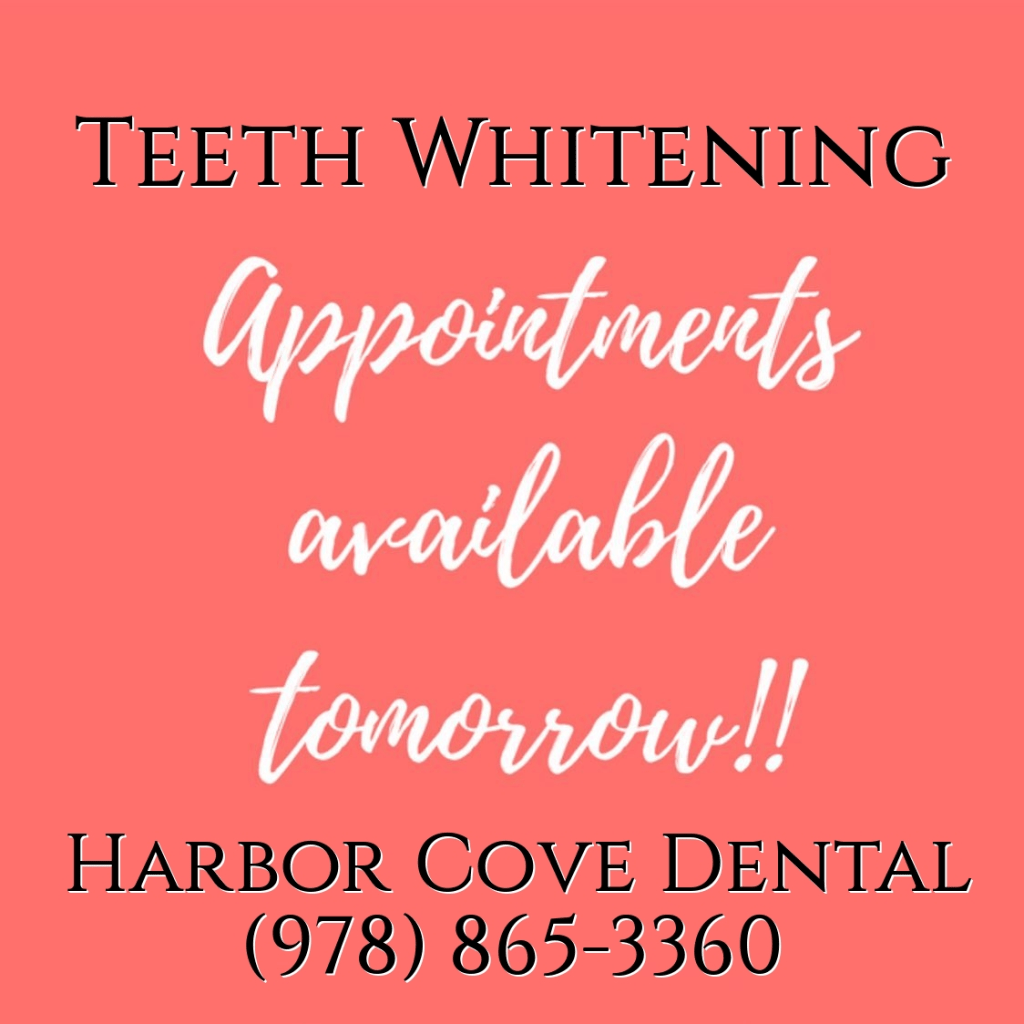 July 18, 2023 by HarborCoveDental We have two teeth whitening appointments open today, Tuesday, July 18th at noon and 2:00 PM. It only costs $99.00 and the whole process takes less than an hour. If you’re interested, please call us at 978-865-3360 to schedule. Share this: Click to share on Facebook (Opens in new window) Facebook Click to share on LinkedIn (Opens in new window) LinkedIn Click to print (Opens in new window) Print Click to share on Tumblr (Opens in new window) Tumblr Click to share on X (Opens in new window) X Click to share on Pinterest (Opens in new window) Pinterest Click to email a link to a friend (Opens in new window) Email Click to share on Pocket (Opens in new window) Pocket Like Loading...