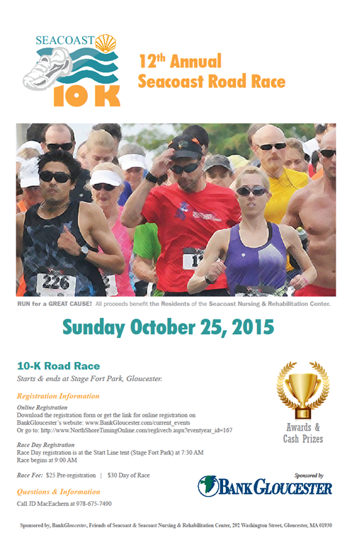The 12th Annual Seacoast Road Race will be held on Sunday, October 25. The race will begin at Stage Fort Park at 9 a.m. and will end at Stage Fort Park. All runners have a chance to win awards and cash prizes. Sponsored by BankGloucester, Friends of Seacoast, and Seacoast Nursing & Rehabilitation Center. Come and join us while we run for a great cause. All proceeds benefit the residents of the Seacoast Nursing and Rehabilitation Center.