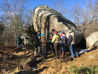 New Year’s Day began with a ‘walk of good intentions.’ Blessed with sunshine and mild temperatures on Cape Ann, friends and strangers came together for a walk in Dogtown. We hiked to Whale’s jaw. A piece of the Whale’s jaw boulder broke off in 1989, but Whales Jaw still stands as it has for over ten thousand years. Standing as a reminder of strength, resiliency and endurance, and symbolic of Gloucester’s fishermen and women. There, we celebrated the new year with a guided meditation and sharing good intentions of gratitude, tolerance and peace.